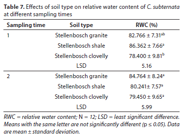 For the three soil types, in the first sampling period, there were no significant differences in the leaf RWC of C. subternata grown on granite and clovelly soil types (p > 0.05). The same observation was made for the comparison between granite- and shale-derived soils. However, water stress significantly decreased (p < 0.05) the relative water content of plants grown in Stellenbosch clovelly when compared with Stellenbosch shale (Table 7). In contrast, the second sampling time showed no significant differences among the treatments. A summary of the p-values for ANOVAs for relative water content per period is presented in Table 8.