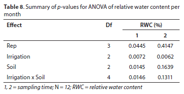 A plant's ability to retain turgor during water-deficit periods guarantees smooth metabolic processes for growth (Cerekovic et al., 2013). Several studies have stated that RWC determination is an efficient method of assessing drought tolerance and plant water status (Slabbert and Krüger, 2004; Li-Ping et al., 2006; Jones, 2007; Obidiegwu et al., 2015). To date, limited studies have been conducted to investigate the water needs of Cyclopia species. Therefore, the aim of this study was to evaluate the effects of 3 different irrigation treatments on growth, yield, proline and relative water content of Cyclopia subternata species of honeybush.