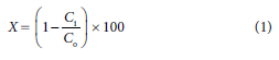where: X is percentage removal (%); Co is initial concentration; Ci is final concentration.