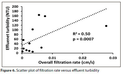 Moreso, the results of the regression ANOVA between filtration rate and effluent turbidity (Fig. 6) indicate that, even though only about 50% of the variability in effluent turbidity can be accounted for by filtration rate, there is a significant relationship between the two variables (p = 0.007).