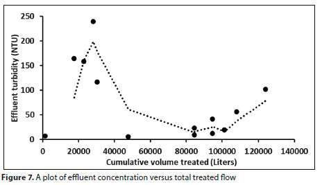 The trendline in Fig. 7 is a two-point moving average between effluent turbidity and the cumulative volume of water treated. The plot reveals that at the start of the experiment, effluent turbidity increased and then gradually decreased before rising again. Filters are generally observed to follow a pattern where performance starts poorly, improves over time and maturation, and then eventually deteriorates again when preferential flow and/or clogging become an issue (Maiyo et al., 2023).