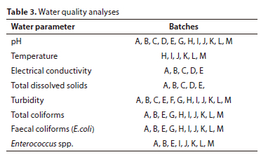 Filtrates were collected from the outlets provided near the bottom of the raw water supply tank, roughing filtration unit and slow sand filtration unit of the multistage filtration system. The samples were analysed for pH, total dissolved solids (TDS), temperature, electrical conductivity (EC), turbidity, total coliforms (TC), faecal coliforms (FC) and Enterococcus spp. (Table 3). A PH-116 multi-parameter water quality monitor was used in determining pH, temperature, total dissolved solids and electrical conductivity of the raw water samples and effluents from filters. The accuracy of the pH was ± 0.1; temperature ± 1°C; electrical conductivity ± 2% EC. Turbidity was determined using the HACH model 2100N laboratory turbidity meter which is designed to measure 0-4 000 NTU turbidity. The membrane filtration method was used to detect TC and Escherichia coli (E. coli) simultaneously using modified faecal coliform (mFC) agar prepared according to the manufacturer's specification, while bile esculin agar was used to detect Enteroccocus spp. (APHA, 2017).