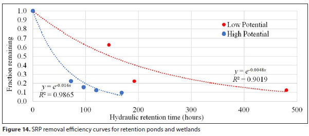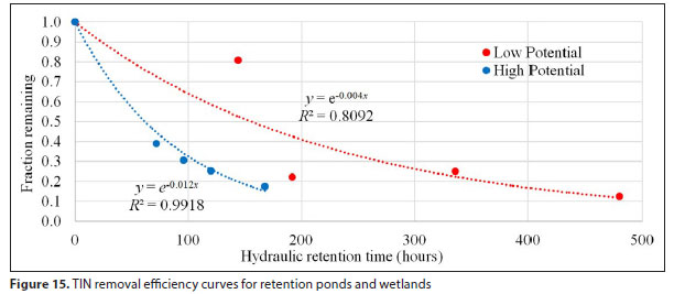 The inevitable variability in wetland and retention pond efficiencies caused by environmental and hydrological factors was catered for by establishing both high- and low-level treatment equations for each indicator to provide potential treatment ranges. The removal efficiency curves for SRP, TIN, TP and TSS for retention ponds and wetlands are presented in Figs 14 to 17 and the equations listed in Table 5.