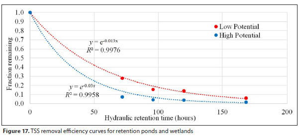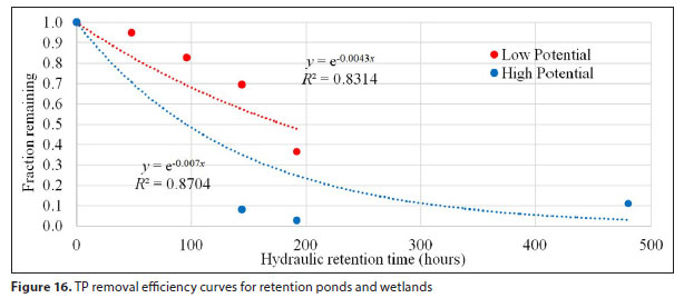 The pollutant removal abilities of regional controls may be modelled in PCSWMM by assigning treatment functions for each pollutant. This could be a fixed percentage removal or a decay function that indicates the pollutant removal by the SuDS SCM over time (CHI, 2021). In this project, first-order decay functions were derived for ponds and wetlands with hydraulic retention time (HRT) as the independent variable based on published experimental data. Decay functions ideally require data specific to each intervention site. Climatic factors, such as temperature, have a significant impact on the treatment ability of SuDS, with higher temperatures generally correlating with higher removal efficiencies (Akratos and Tsihrintzis, 2007). Therefore, published data on the performance of wetlands and ponds from systems with similar climates to that of Cape Town were prioritised. Since PCSWMM requires that treatment equations be defined in terms of fractional removal the decay function curves were used in the form:
