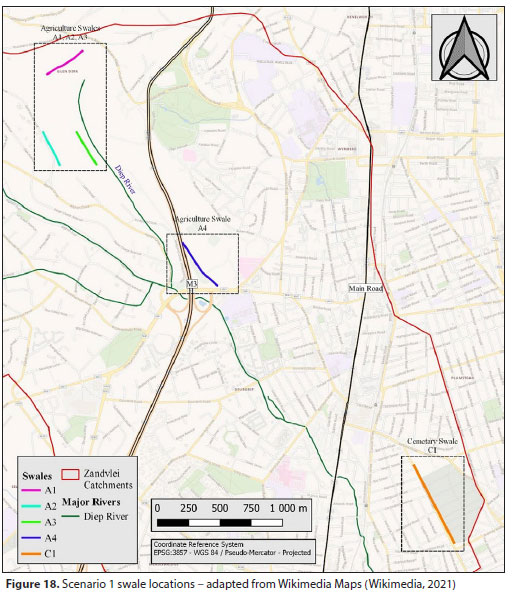The agricultural areas (A1, A2, A3 and A4) on either side of the M3 Freeway produce crops that often require fertilisers, pesticides and other products that may result in poor quality runoff. Large SuDS are not viable in these areas as they would reduce the productive agricultural area, thus swales were deemed the most effective interventions. Four large swales were placed along the contours to reduce the slope, and as close to boundaries as possible to reduce the intrusion into productive agricultural land (Fig. 18).