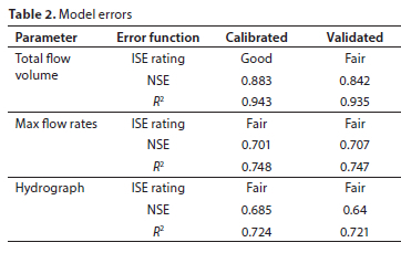 Table 2 presents the model errors after calibration and validation. Values were determined for: the total flow volume, max flow rates, and comparison with measured flow hydrographs; and 3 error functions were used: integral square error rating (ISE), Nash-Sutcliffe efficiency (NSE), and coefficient of determination (R2). Although the minimisation of model error is of the utmost importance, there is no generally accepted standard for what might be considered acceptable (James, 2005). Moriasi et al. (2007) and Golmohammadi et al. (2014) suggest an NSE value between 0 and 1 and an R2 of greater than 0.5, while Santhi et al. (2001) recommend an NSE value greater than 0.5 and an R2 value greater than 0.6. The calibration was considered acceptable for this study as both NSE and R2 were significantly greater than 0.5 for all parameters measured.