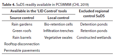 SuDS may be implemented in PCSWMM using the 'LID Control' tools. The tools offer 9 SuDS Stormwater Control Measures (SCM) (Table 4). Pollutant removal in them is closely associated with stormwater removal through infiltration. Unfortunately, no 'regional controls, i.e., ponds and wetlands (Armitage et al., 2013), are included among the tools; however, it is possible to model regional controls by inserting conduits, junctions, and storage units. New sub-catchments were created in the PCSWMM model to represent individual SuDS SCMs (Fig. 13). This allowed for the creation of treatment trains as the outflow of one SuDS SCM can be directed into others downstream.