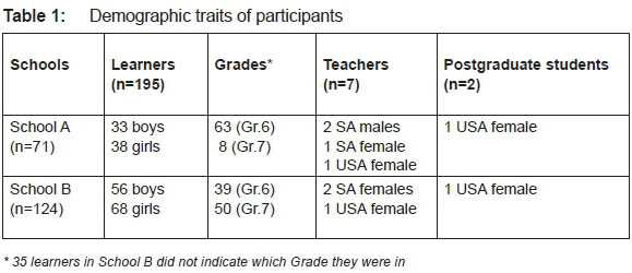 In total, 195 questionnaires were returned. Of these 71 (36%) at School A and 124 (64%) at School B (Table 1). The majority of learners (102; 52%) were in Grade 6 while 58 (30%) indicated that they were Grade 7 learners. Thirty-five (18%) learners did not indicate which grade they were in. The majority of learners (106; 54%) were female. Two female Miami teachers, two female UM postgraduate students, two male and three female South African teachers participated in this study. Both UM postgraduates students are pursuing Ph.D. degrees in biology at UM.