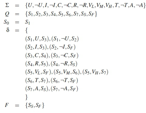 The states are elaborated further in Section 4. A description of the full state machine in mathematical notation follows. The finite state machine is a 5-tuple consisting of the finite set of input alphabet characters Σ, the finite set of states Q, the start state So, a set of accepting states F, and a set of state transitions δ that contains 3-tuples representing state transitions. A 3-tuple in δ consists of a current state, a current input and the next state.