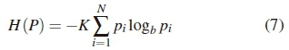 The Shannon entropy function H of the probability distribution P = (p1,p2,p3,...,pn) consisting of n possibilities in the distribution is calculated by: