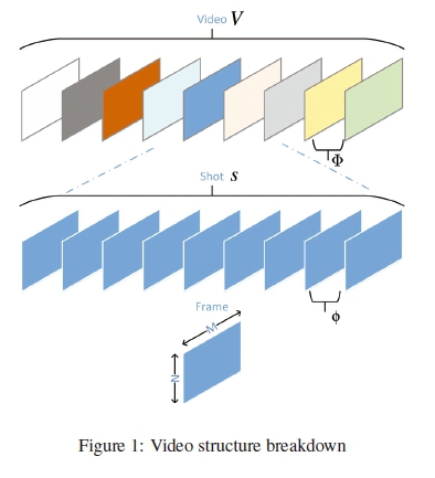These shots are defined as video segments that are visually contiguous and generally captured during a single take. This implies that although the visual content might be varying as is the nature of videos, the inter-frame variances φ should be small compared to the inter-shot variances Φ. The underlying structure of a shot consists of multiple sequential static frames f: