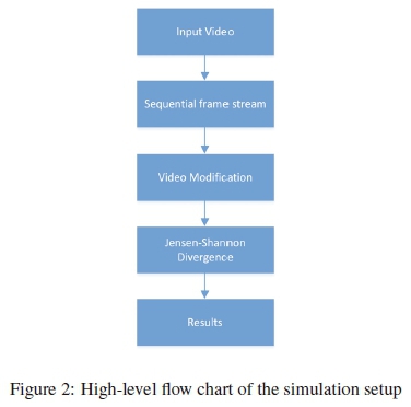 The video modifications mentioned in figure 2 pertains to the colorspace as well as the size of the video. All the videos used in the analysis are natively colour videos in the RGB domain. This specific implementation of the Jensen-Shannon divergence utilises only a single representative information source to calculate the inter-frame variance. This implies that all input videos frames are converted or flattened to the monochrome colorspace. This allows the grayscale luminescence to be used as the basis for the probability distribution.