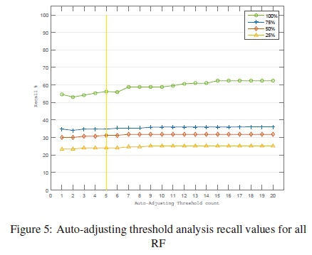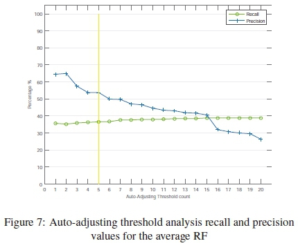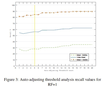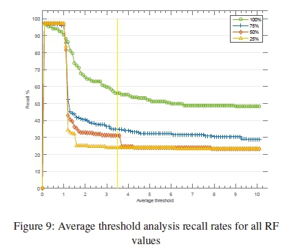 The second parameter to be evaluated was the average threshold sensitivity while using the previously calculated frame count ω = 5. The recall rates obtained show a quick decline before appearing to stabilise as seen in figure 9.