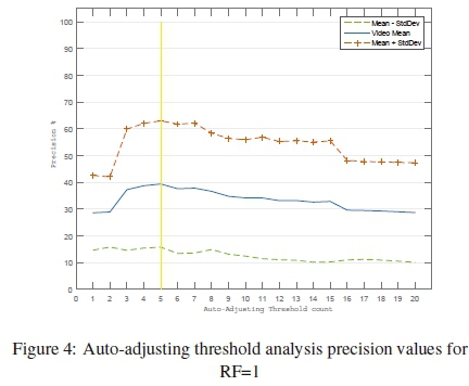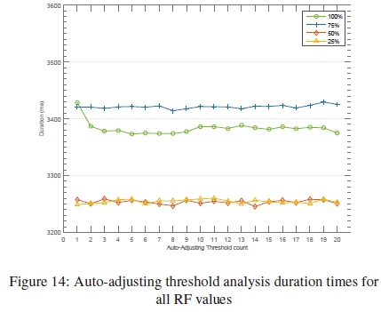 The analysis durations for the auto-adjusting threshold frame count analysis is illustrated in figure 14 from which it is evident that the analysis duration follows a fairly linear pattern, where ω > 2, with the exception of the initial threshold value of RF=1.