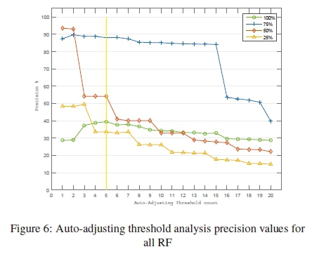 The precision rates present with a large initial increase that appears to level off at higher threshold levels shown in figure 10. The intersecting point for RF=75% is situated at α ≈ 1.2 which results in recall and precision rates of approximately 49%. The best rates are obtained where RF=100% where α = 5.7 resulting in recall and precision rates of 51%. The intersecting point when evaluating the average for all RF values is located at α = 2 with recall and precision rates of approximately 41% as illustrated in figure 11.