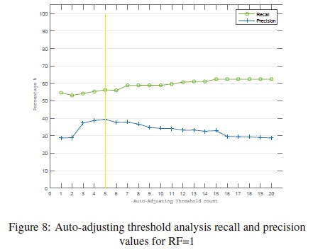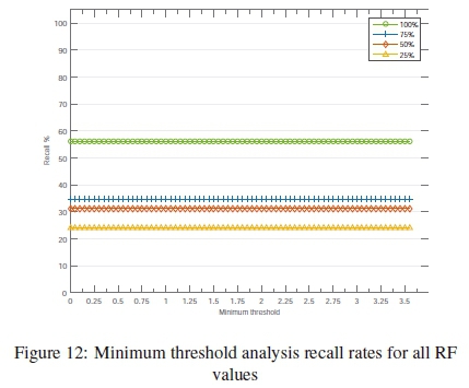 The sensitivity of the detection technique to variations in the minimum threshold was analysed while using an average threshold α = 3.5 and a frame count ω = 5. This analysis indicated that any variations in the minimum threshold 0 ≤ η ≤ α does not relate to any change in the recall and precision rates for any RF as shown in figures 12 and 13.