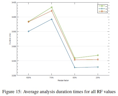 With regard to the real-time component, the maximum average duration encountered at RF = 75% at approximately 3435ms. When comparing this maximum to the average duration of the test video 9985ms, it is clear that the real-time criteria will be met as the analysis duration is at least 2.9 times faster than the playback duration. In order to ensure that unbiased timing was achieved, each value for each parameter under investigation was analysed 10 times with the average thereof taken as the analysis duration for that instance.