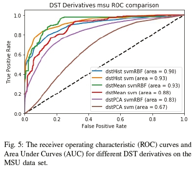 From the experiment results, we can see some DST derivatives did not perform well in terms of accuracy. The worst performer was using principal component analysis (PCA) on the raw shearlets to achieve dimensional reduction. Showing that the dimensional reduction comes at the cost of feature specificity. Alternatively, in a similar vein to using LBP-based histograms, the other DST derivative we assessed computes histograms for the original shearlets. It performed better than PCA and resulted in a compact representation, which may be beneficial in certain contexts, but was not as consistent as the dstMean in our study. The best performer was the DST mean-based derivative, which achieved an AUC of 93%. Another finding was that radial basis function or gaussian kernel-based support vector machine (SVM) classifiers performed better in terms of accuracy at the cost of longer training and testing times.