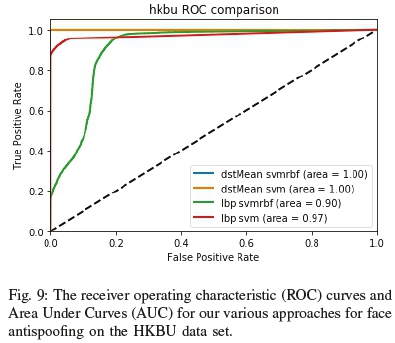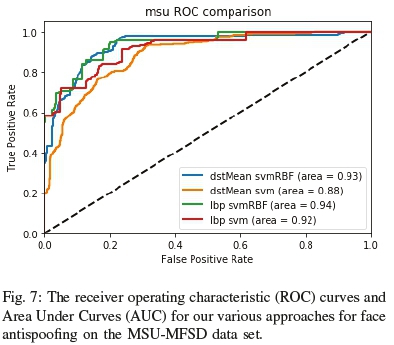 We evaluated the performance of our approach using three different datasets and compared its results with LBP. The performance of the approach is determined in terms of the receiver operating characteristic (ROC) curve to determine its accuracy for each respective data set (CASIA, MSU, OULU and HKBU). The equal error rate (EER) is then calculated for each data set and compared with current approaches (as seen in table I) to provide perspective on the results. Additional metrics, namely time taken, memory usage, accuracy, precision, recall and f1-score, are then derived for the best approach to form the evidence for our empirical study.