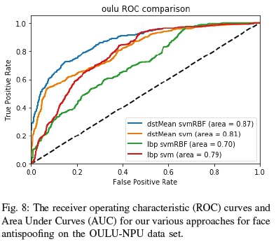 For the OULU dataset results (Figure 8) the significant environmental changes can be seen to impact performance. The LBP variants could not breach an AUC of 80%, whereas the dstMean variants fared relatively well. Interestingly enough, as seen in Figure 7 and 8 the choice of linear and RBF-based SVM's exhibit different results for LBP and DST by a margin of 5-6%, thereby validating it as a better choice for face antispoofing methods than LBP-based methods. However, as investigated by the author, face antispoofing efforts at the higher resolution scale still have room for improvement even when using DST's.