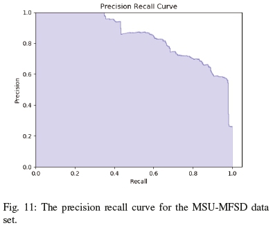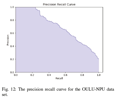 By analysing table IV and the precision-recall curves for all the datasets, we can draw insights into how dstMean-based descriptors are used for face antispoofing. From the f1 score, we can see that the datasets contain little class imbalance issues and that the descriptor is fairly stable when comparing precision to recall. From the results, we can see that although dstMean-based descriptors perform well overall and it is tolerant to lighting changes, but as seen in the precision-recall curve of the OULU dataset in Figure 12, the varying backgrounds contribute towards error.
