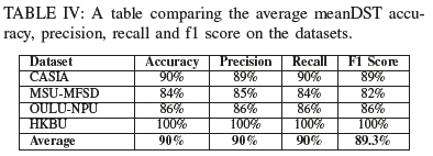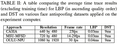Overall, the DST-SVM(RBF)-based implemented system detected most of the spoofing videos under varying environmental conditions and video qualities with a minimal resource footprint. Deriving DST features on average consumed around 311MB of RAM on average took 9ms to complete. This provides proof that our proposed approach can potentially be used in a low resource environment and still achieve real-time detection. Whereas other methods would require a networked solution to offload computation to a server or require additional computation or memory resources.