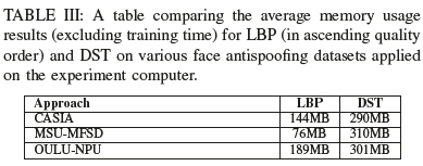 In tables II and III, we can also see that the timing and memory results on a modest computer are reasonable and the approach allows for real-time detection. As expected, when the quality of the video increases, so does the time it takes to derive the results using LBP. As seen in table II our DST approach achieves relatively stable timings irrespective of the image quality difference, thereby allowing it to scale better at higher resolutions. When looking at the memory usage, LBP does use more memory for the OULU data set, but not for the MSU-MFSD data set. Interestingly, as seen in table III when using LBP, the memory usage was not as consistent as the DST approach's memory usage. Upon further inspection, the MSU-MFSD dataset's drop in memory usage during processing can be attributed to a lack of textures derived when using their specific mobile device cameras, thereby affecting accuracy and specificity. The resource usage shows that the DST approach works well considering the 4GB memory and processing power constraint.