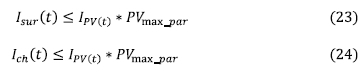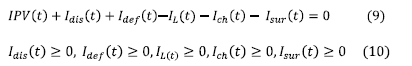 During charging mode (ΦCh(t) - 0), the PV system charges the battery. There is no discharge current and deficit current.