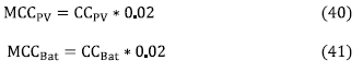 Maintenance cost of PV modules and Batteries per year is assumed to be 2% of the capital costs [4]. This is presented in (40) and (41) respectively.