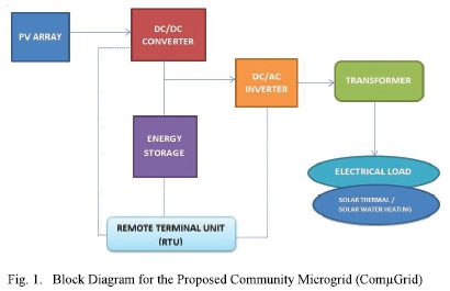In this research a solar PV community microgrid (ComuGrid) whose components are indicated in the block diagram shown in Fig. 1 is presented and optimally sized.