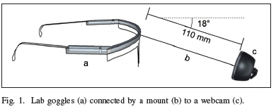 A schematic of the apparatus and its dimensions is shown in Figure 1. A Logitech C270 (Logitech International S.A., Lausanne, Switzerland) webcam with 1280x720 pixels, operating at a 30-Hz framerate, was mounted on a pair of 570295 Evrigard Euro Anti Scratch Spectacle - Clear laboratory safety goggles (Evrigard, Johannesburg, South Africa). An aluminium mount was bolted to the upper frame of the goggles, positioning the webcam 110 mm from the eyes, at an elevation of -18°. The eye tracker goggles were worn by a user seated at 52-cm horizontal distance from the 15,6" liquid crystal display of a Lenovo IdeaPad 300-15ISK 80Q7009DSA laptop computer (Lenovo Group Limited, Beijing, P.R. China) with 1366 x 768 pixels.