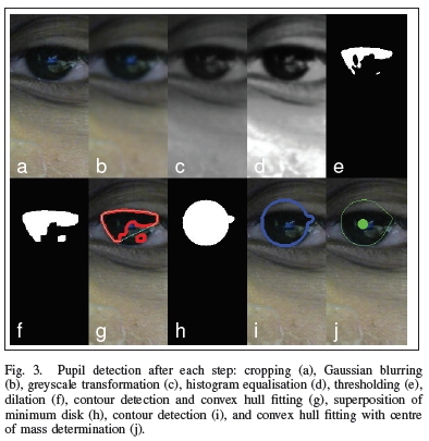 The pupil detection algorithm is illustrated by Figure 3. In an image, the area containing the eye of choice was automatically cropped using the known dimensions of the positions of the hardware. The image was flipped so that its direction axes corresponded to those of the computer display (cf. Figure 3a). Gaussian blurring was performed using an 11 X 11 pixels core convolution kernel, with a standard deviation of 0 in both x and y directions (cf Figure 3b). The image was converted to 8-bit greyscale (cf. Figure 3c), which was followed by linear histogram equalisation (cf. Figure 3d). The image was inversely thresholded with grey values of 12 and less converted to 1 (white) and grey values higher than 12 converted to 0 (black) (cf. Figure 3e). This binary image was subjected to three iterations of dilation with a 3x3 pixels kernel (cf Figure 3f). After contour detection (cf. Figure 3g, bold red lines), the largest contour was automatically selected, which was subjected to convex hull fitting (cf. Figure 3g, thin green line). The centre of mass was determined from the moments inside the convex-fitted contour, whilst the minimum enclosing circle around the convex fitted contour was computed to determine its radius. A white disk with this radius and a centre corresponding to the centre of mass mentioned was plotted over the binary image after dilation (cf. Figure 3h), followed by contour detection (cf. Figure 3i, bold blue lines), automatic selection of the largest contour, convex hull fitting thereof (cf Figure 3j, thin green line), and computing the centre of mass. The new centre of mass was taken as the pupil position (cf. Figure 3j, bold green dot) and stored as point (x, y).