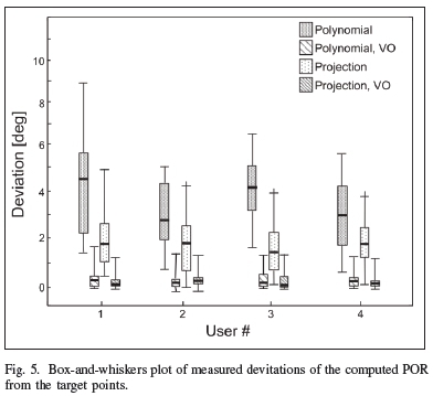 The full dataset is represented in the box-and-whiskers plot in Figure 5. For all users, the deviation in the points of regard was greater when using POLYNOMIAL compared to when using PROJECTION. The source data of the box-and-whiskers plot are shown Table II. When moving the head, the accuracy of gaze estimation, represented by the deviation angle, was less than 1° for all users, independent of the algorithm used. The deviation angle was narrowed when moving the head, increasing the accuracy of gaze estimation. This confirms our hypothesis that leaving the head to freely move during eye tracking must produce more accurate results than keeping the head fixed, only allowing the eyes to move.