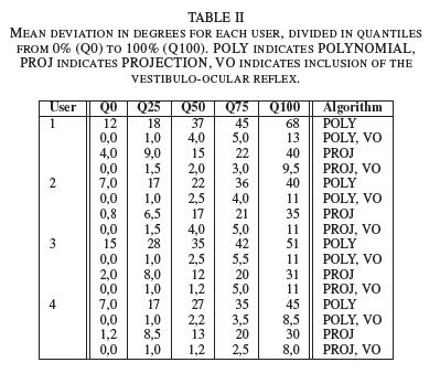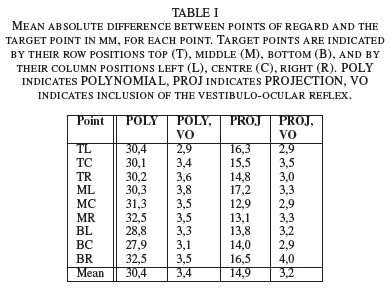 Table I shows the mean absolute difference between points of regard and the target point [in mm], for each point, averaged over all users. PROJECTION was more accurate than POLYNOMIAL for most points. Incorporating the vestibulo-ocular reflex drastically lowered the deviation in both algorithms, to an equal deviation of 3 mm.