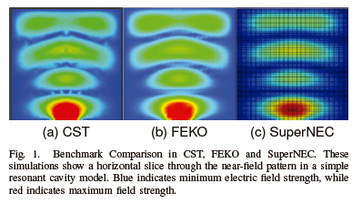 The near-field pattern in the horizontal plane was the metric used to compare the programs. The result of the benchmark simulation is shown in Fig. 1, displaying a near-identical field pattern elicited from CST and FEKO, with a similarity to SuperNEC's result. CST and FEKO use a waveguide port feed mechanism, whereas SuperNEC uses a monopole feed, accounting for the difference in result. Because FEKO and SuperNEC used a MoM solver, their power and average electric near-field strength were compared. Two SuperNEC models were compared to the FEKO model. The waveguide in the second NEC model was elongated to emulate a plane wave. For FEKO and the first NEC model, a radiated power ratio of ≈69 : 1 and a voltage ratio of ≈7.6: 1 was evident. This indicates a power-to-voltage ratio of ≈9.1:1. For FEKO and the second NEC model, a power ratio of ≈238 : 1 and a voltage ratio of ≈24.8:1 was evident, indicating a power-to-voltage ratio of ≈9.6: 1. The similar ratios indicate that different feed mechanisms for a given model and solver result in a linear field scaling factor. The consistent factor speaks to validity, further proving that the different programs yield similar results.