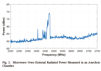 2)Operating Frequency: Cavity magnetrons deliver energy to microwave ovens. The operating frequency of a magnetron is not precise and is variable. This frequency change is partly influenced by 'pulling' and 'pushing' on the magnetron from changes in the reflected power and internal cathode current. Radiated microwave leakage from the oven was measured to determine the range of frequencies over which the magnetron operates. A log-period dipole array (LPDA) was used to measure the radiation emanating from the operating oven in an anechoic chamber.