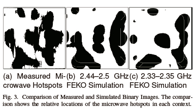 Based on the determination of the microwave's operational frequencies, the model simulation focused mainly on the 2.4-2.5 GHz range, with coarse simulations spanning 2.2-2.7 GHz. The field patterns within that range were compared to the measured fields. 12 measurements were conducted to measure the near fields inside the microwave oven. The 3 clearest images were selected and processed. The best matching range was 2.44-2.5 GHz. Within the range, 4 major patterns were evident at 2.442, 2.459, 2.489, and 2.497 GHz. Another similar pattern was evident outside the determined range, at 2.33-2.35 GHz, using a polystyrene dielectric model with different properties. The images of these field patterns were processed to create binary images like the measured images. Fig. 3 shows a comparison of the binary hotspot images. The binary images create a platform where like-for-like hotspot positions are discernible. The demonstrated similarity between the simulations and the measured results verifies FEKO's simulation for the application. From Fig. 1, which indicates approximate identical results between CST and FEKO, it was concluded that both programs were suitable to proceed with the investigation.