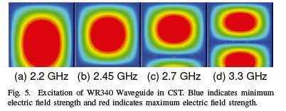 The frequency sweep in CST shows modal behaviour in the waveguide's recommended operating band of 2.2-3.3 GHz, as depicted in Fig. 5. This demonstrates that mode TE10 dominates between 2.2-2.7 GHz. At 3.3 GHz, TE20 starts dominating, confirming that 2.2-2.7 GHz is the practical simulation frequency range.
