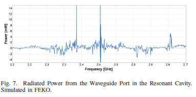 3)Bandwidth: FEKO was used to simulate the radiated power at the waveguide port entering the cavity. Fig. 7 depicts peaks at the expected frequencies. The resonant peaks are shown to be narrowband, in the order of 100-200 kHz. This demonstrates the sensitivity of the resonance within the cavity.