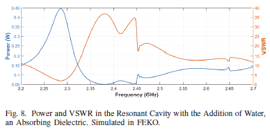 4) Dielectric Influence: The addition of the cylinder of water introduced an absorbing body into the cavity. This made it possible to investigate the system's VSWR. VSWR and power were both simulated. These are shown in Fig. 8. The power curve exhibits higher stability and no resonant peaks, indicating the high dielectric sensitivity inherent to resonant systems.