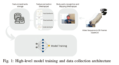 We used OpenCV [25] in the project to capture live video from either the external camera or the laptop webcam. Following that, the frame was sent to the MediaPipe function for feature extraction. The extracted features is then saved in local files for the training section and used for model training and testing later, as can be seen in Fig. 1. For Kinyarwanda sign language recognition, the extracted feature will be passed to the model for detection, as it can be seen in Fig. 2