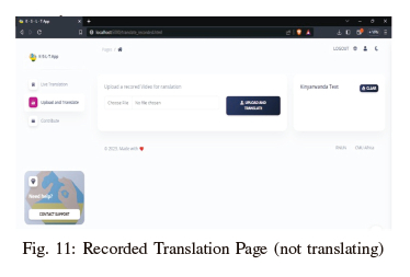 The second page of the web application is responsible for the translation of the recorded video. The video to be translated is first uploaded to the application and then translated. The translation begins automatically upon successfully uploading the video. The page has a form element to upload the video which is a file input element. Other elements on the page are the element to display the video, the element to display the translated text, and a button to clear the translated text.