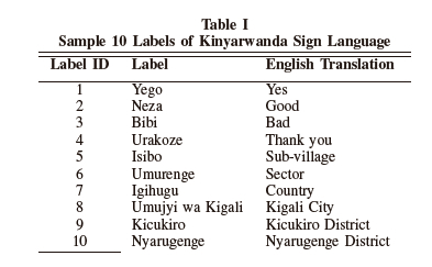 Table 1 was extracted from the live video feed sequence of Kinyarwanda's relevant gesture sign for the labels.