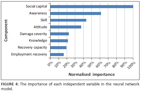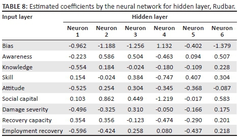 Neural network analysis confirmed that almost all the potential factors that were identified at the first stage of the study are related to total resilience (except for 'recovery capacity' in the Bam model and 'attitude' in the Rudbar model). In addition, social capital was introduced as the most effective indicator of resilience.