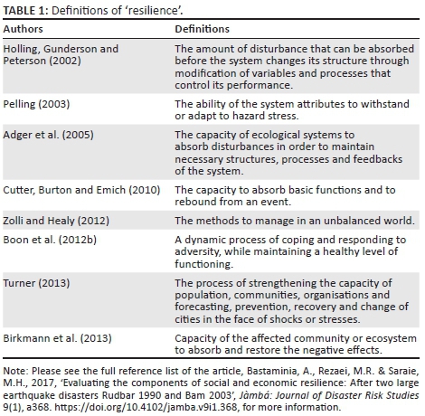The term 'resilience' originates from the Latin word resilio, meaning 'bounce back' (Manyena 2014). Resilience has been linked to a number of basic sociological concepts, including crisis, economic poverty, sustainability and vulnerability (Thieken et al. 2014).