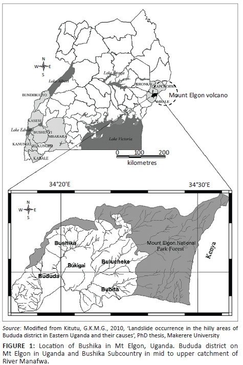 A landslide is a downslope gravitational movement of a mass of earth or rock as a unit owing to failure of the material (Highland & Bobrowsky 2008). Landslides are a neutral phenomenon and a normal feature of landscapes experiencing dissections, but their magnitude, frequency and geographical distribution have been considerably modified in recent years by human intervention (Jones 1992). Human activities, such as poor logging practices and over-cultivation on unstable steep slopes, accelerate landslide occurrence, but activities including deforestation, farm cultivation, forestry restoration and prevention work are the key factors influencing the timing of landslide density changes in the short term (Chang & Slaymaker 2002). Landslides and mass movements are historical problems in the highlands of East Africa (Bagoora 1988; Kimaro et al. 2005; Muwanga, Schuman & Biryabarema 2001; Ngecu & Mathu 1999; Omara-Ojungu 1992; Temple & Rapp 1972), and this is largely attributed to high annual rainfall, steep slopes, land use change, high weathering rates and slope materials with a low shear resistance or high clay content (Knapen et al. 2005). Vegetation cover is an important factor influencing the occurrence and movement of rainfall triggered landslides, and changes to vegetation cover often result in modified landslide behaviour (Glade 2002). The change in land use has been recognised throughout the world as one of the most important factors influencing the occurrence of rainfall triggered landslides. Land-use change (conversion of forest into agricultural land), especially on the foot slope, causes disturbance to the natural balance of the slope (Paudel, Joshi & Devkota 2006). In Uganda, the most vulnerable area is Mt Elgon and, in particular, Bushika Subcounty in Bududa district. The narrations by local people indicate that landslides are an old problem in this area and have caused destruction of much property and loss or injury to human life (Kitutu 2006). More than 500 people have lost their lives in the last half a century. The exceptional heavy rains of 1997-1999 moved a large amount of slope material downslope. In 1997, at least 48 people were killed, the crops and dwellings of 885 families disappeared from the map, 5600 people became homeless, arable land was reduced causing land scarcity and property conflicts, water supplies were polluted with a consecutively epidemic and, finally, the districts were hit by food shortage (Knapen et al. 2006). The landslides of 2010 in Namesti caused tremendous havoc: moved massive fertile soils downslope, destroyed farmlands, killed over 300 people and led to displacement (Atuyambe et al. 2011; Mugagga, Kakembo & Buyinza 2012).