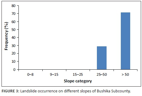 The results indicate the dominance of landslide scars on steep slopes ranging from 50% to over 80% and covered mainly by ferralsols and nitisols. Fewer landslides were identified in the forested areas pointing to the effect of tree root stability among other factors as also noted by Mugagga et al. (2012). Most landslide scars were in the cultivated areas grown with bananas, maize and Arabic coffee, hence indicating the significance of anthropogenic influence. Based on the reviewed literature, the main factors triggering landslide occurrences in the area are heavy rainfall and disturbed steep slopes.