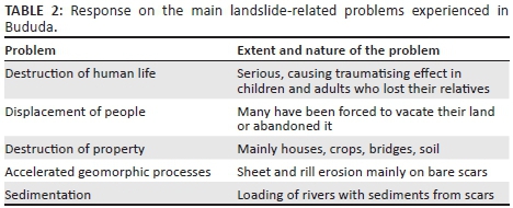 Landslides are among the most frequent and damaging environmental hazards in the study area, causing loss of life, loss of livelihood and disruption to road traffic and economic activity. The occurrence of landslides is thus associated with environmental, socio-economic and political problems, both directly and indirectly. Table 2 summarises the problems identified during participatory rural appraisal (PRA) discussions and through informal interviews. The problems include loss of human life, displacement of people, destruction of property, accelerated geomorphic processes and reduced water quality through increased siltation load.
