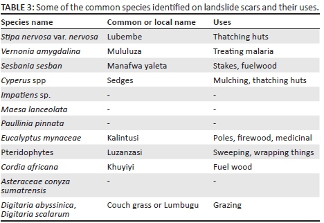Natural plant regeneration - As a traditional practice, the landslide scars are commonly abandoned for some time, ranging from as short as 2 years up to a decade or beyond depending on many factors (e.g. land scarcity, depth of the scar) to allow for recovery and to avoid further problems of sliding (secondary slides). This provides opportunity for natural plant regeneration or restoration of the degraded areas. Planting or encouraging natural growth of vegetation can be an effective means of slope stabilisation (Highland & Bobrowsky 2008). As indicated by Temple and Rapp (1972), colonisation of slide scars by vegetation and the development of soil on their surfaces will occur at variable rates, depending on a wide range of factors such as altitude, depth of the slide scar in relation to soil and/or regolith and the availability of soil moisture and of colonising species. This is further supported by Gecy and Wilson 1990 cited in Stoke et al. (2014) who argue that revegetation patterns will depend largely on the response of both vegetative re-sprouts and seedlings, the number of disturbances already incurred at the site, the initial species composition before the debris flow and the position of the regrowth along the debris flow. Some of the plant species that had colonised the scars surveyed in the study area are listed in Table 3. Preliminary observations revealed that the plants in the neighbouring farmlands or bushland outside the scars have enhanced colonisation of scars. There is, however, need to accelerate the restoration through selective planting of trees and shrubs that can provide multiple benefits to farmers. This is supported by McBride and Voss (1990) who observed that planting of agroforestry species useful for fuel wood and/or forage is most likely to be adopted by farmers as a low-cost but expeditious strategy for landslide rehabilitation. They further argue that manipulation of temporal patterns of natural plant establishment is directly relevant to ecosystem restoration, a logical focus being the immediate re-establishment of woody vegetation after disturbance on very steep slopes.