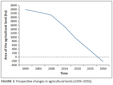 The results showed 2384 ha in 1999, then 2256 ha in 2003, 2097 ha in 2009 and finally 1541 ha in 2014. For a study area of 4360 ha, the agricultural land varied from 54.68% in 1999 to 35.34% in 2014 (Figure 3). On average, the area of the agricultural land decreased at a rate of 110 ha per year between 2009 and 2014. Assuming a linear evolution of the dynamics of the land use, the results highlighted a risk of disappearance of agricultural lands in the Niayes region of Diamniadio towards 2050. In 2025, the area of cropland remaining is predicted to be 300 ha (Figure 4).
